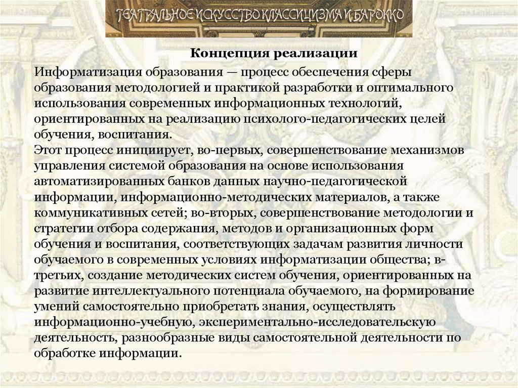 Концепция реализацииИнформатизация образования — процесс обеспечения сферы