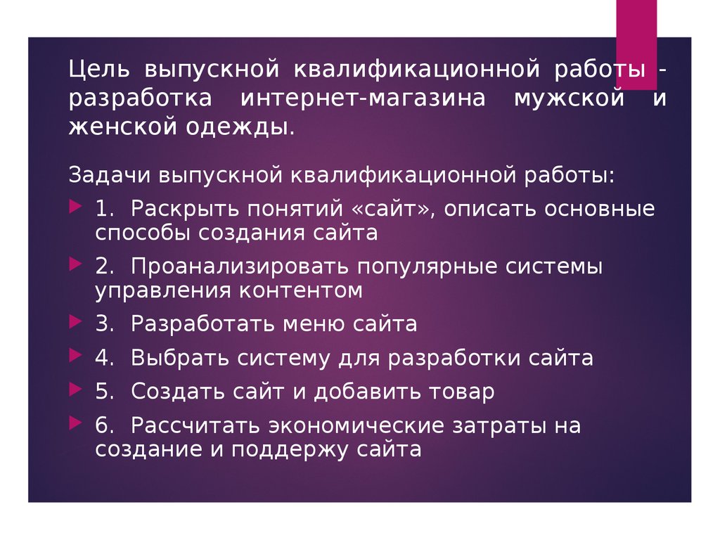Цель выпускной квалификационной работы разработка интернет-магазина мужской иженской одежды.