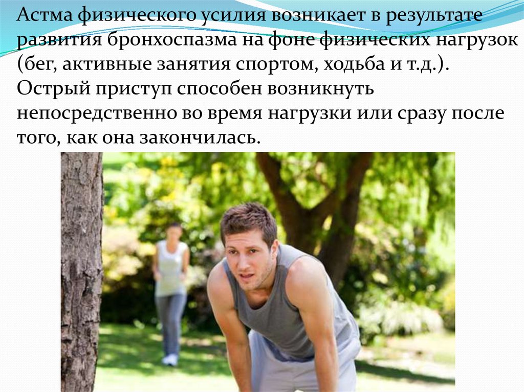 Астма физического усилия возникает в результатеразвития бронхоспазма на фоне физических нагрузок