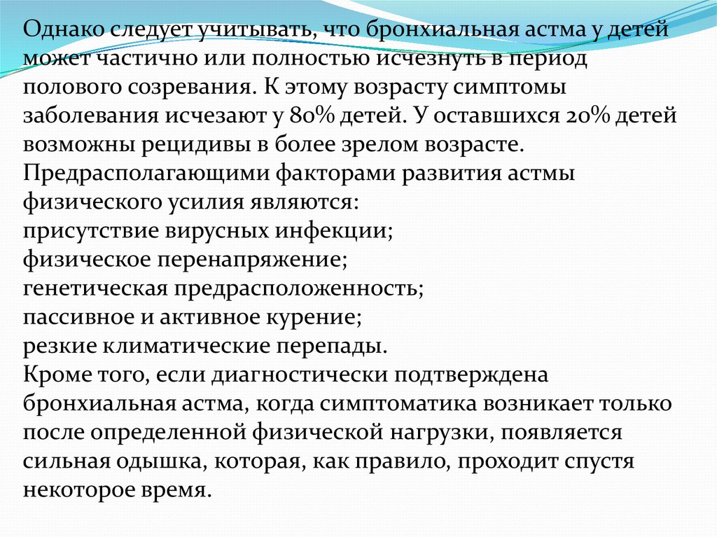 Однако следует учитывать, что бронхиальная астма у детейможет частично или полностью исчезнуть в период