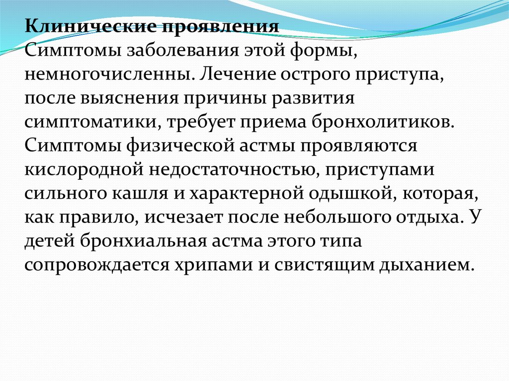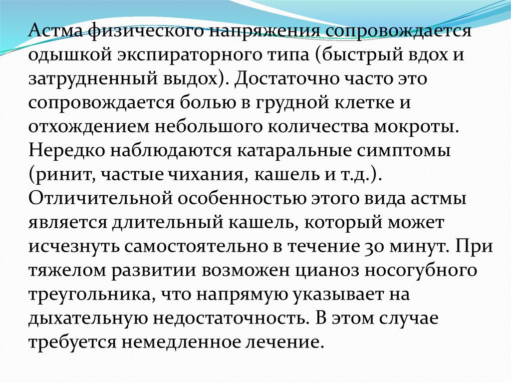 Астма физического напряжения сопровождаетсяодышкой экспираторного типа (быстрый вдох и