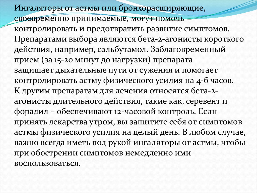К другим препаратам для лечения относятся бета-2агонисты длительного действия, такие как, серевент и