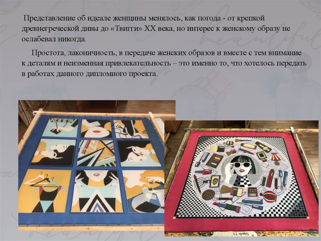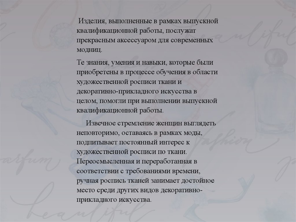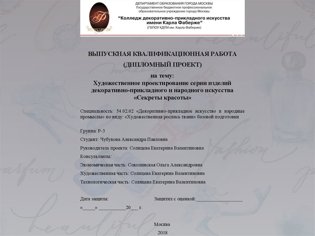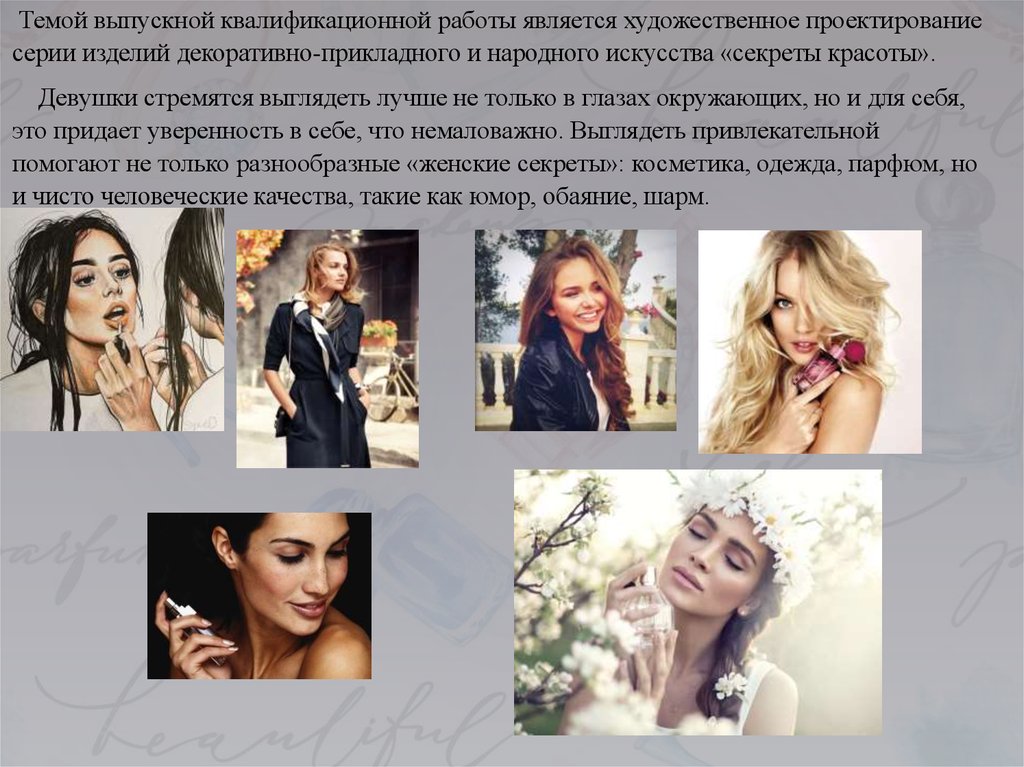 Темой выпускной квалификационной работы является художественное проектированиесерии изделий декоративно-прикладного и народного искусства «секреты красоты».