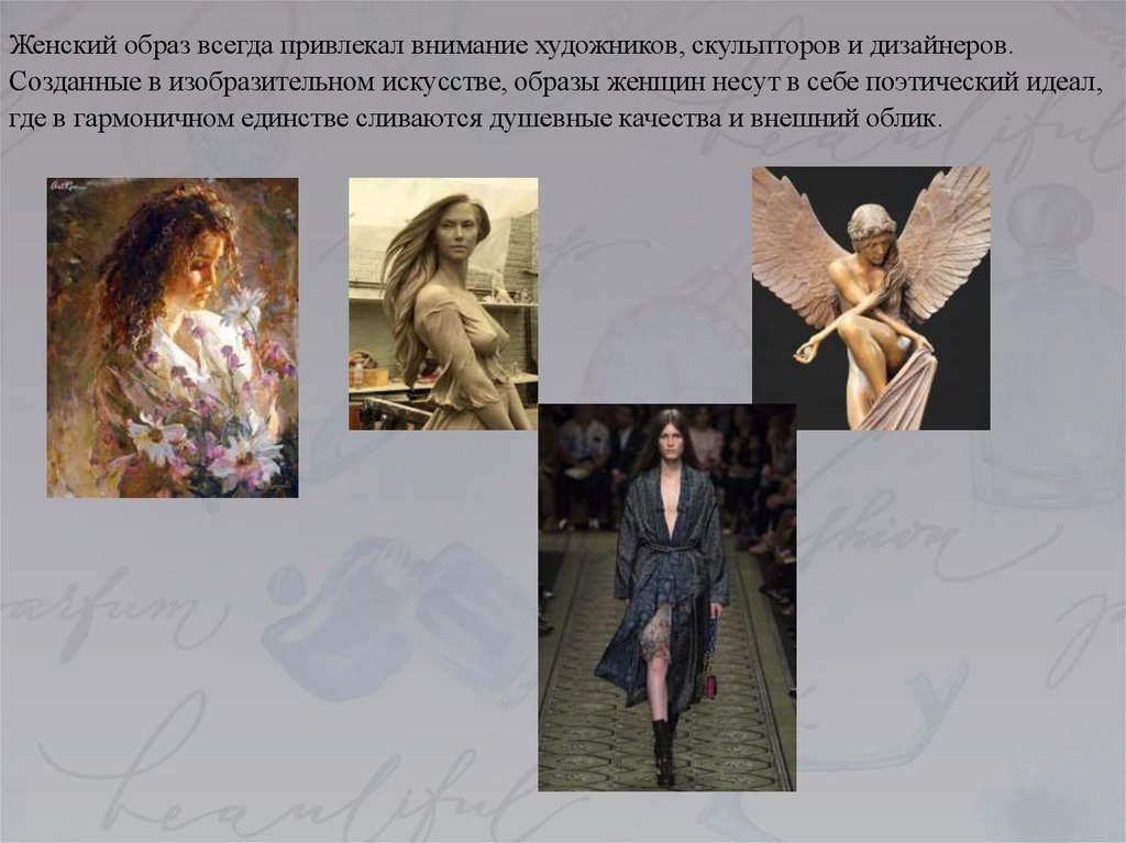 Женский образ всегда привлекал внимание художников, скульпторов и дизайнеров.Созданные в изобразительном искусстве, образы женщин несут в себе поэтический идеал,