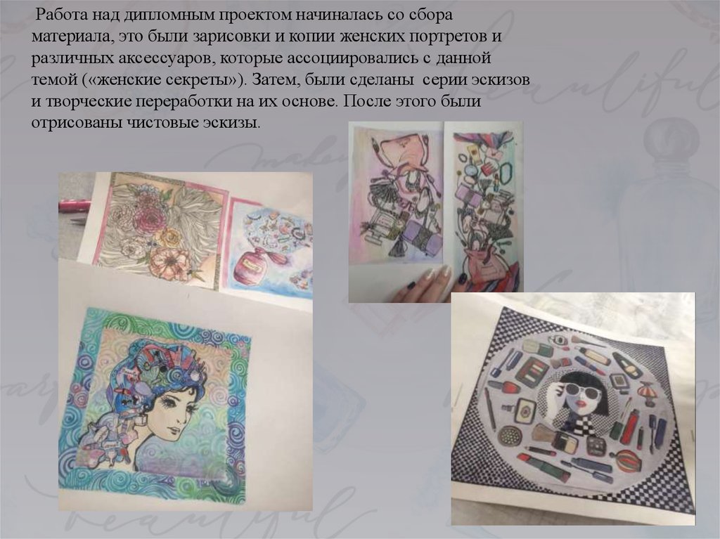Работа над дипломным проектом начиналась со сбораматериала, это были зарисовки и копии женских портретов и