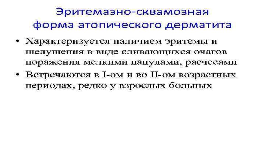1. Периоды, фазы и стадии развития атопического дерматита:Начальная стадия – появляются первые изменения на коже, которые не сильно