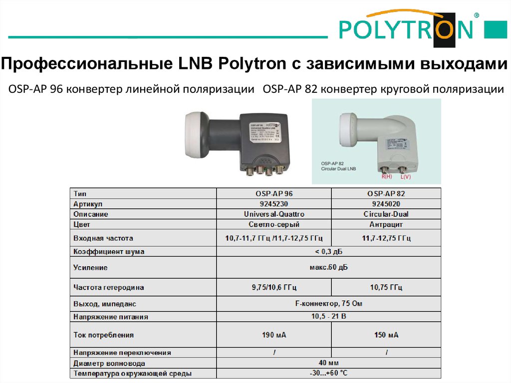 Профессиональные LNB Polytron с зависимыми выходамиOSP-AP 96 конвертер линейной поляризации OSP-AP 82 конвертер круговой поляризации