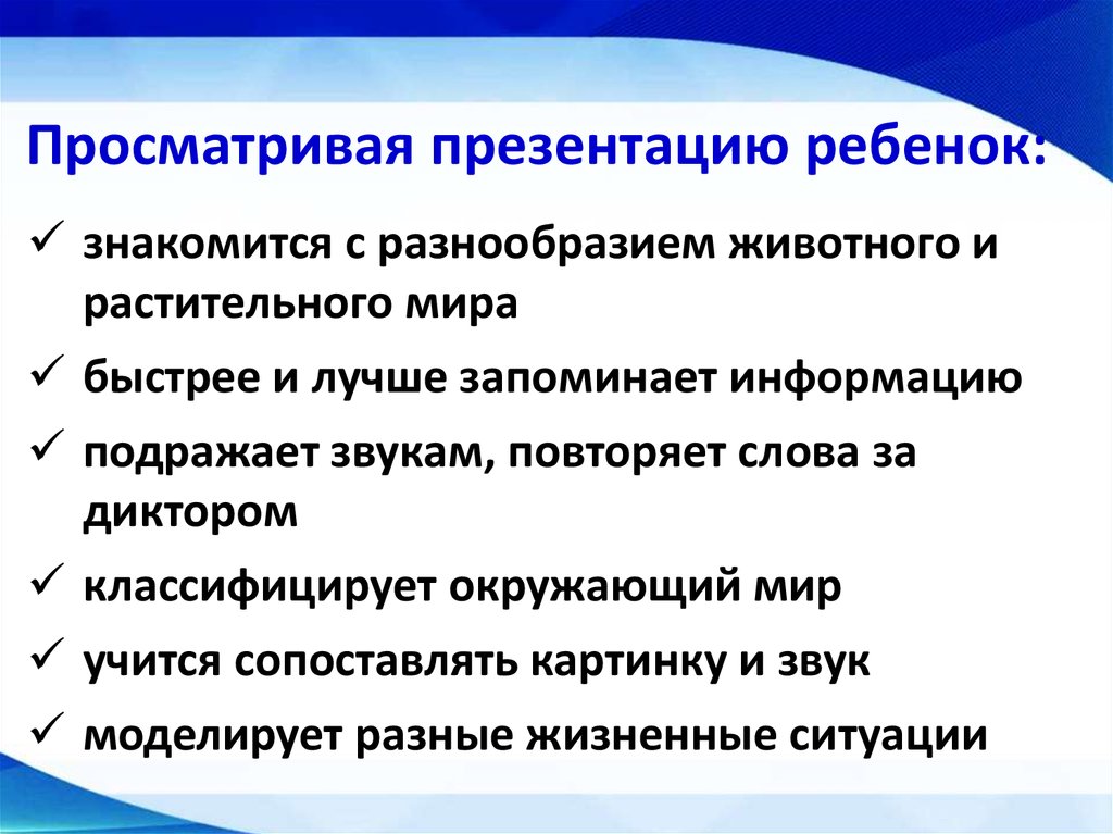 Просматривая презентацию ребенок:знакомится с разнообразием животного и