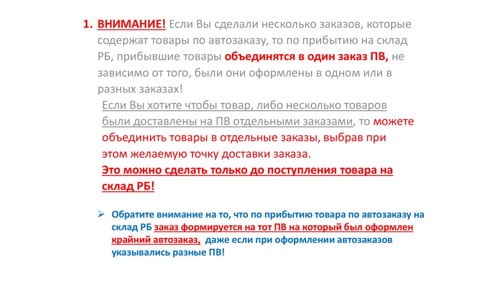 1. ВНИМАНИЕ! Если Вы сделали несколько заказов, которыесодержат товары по автозаказу, то по прибытию на склад