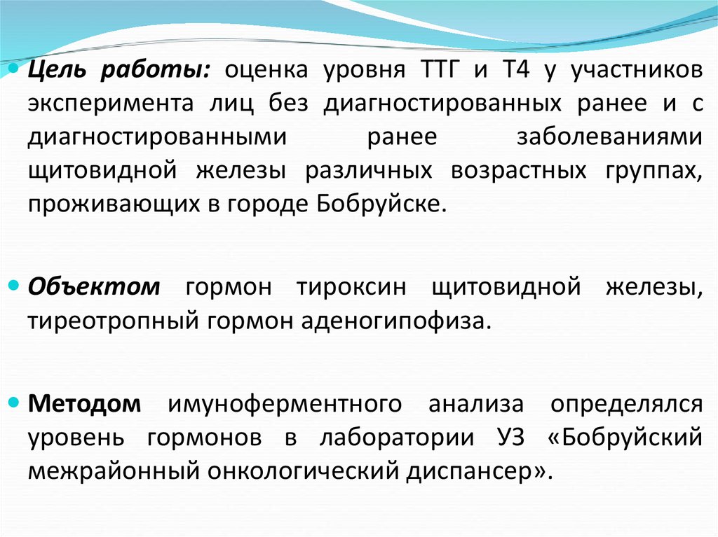 Цель работы: оценка уровня ТТГ и Т4 у участниковэксперимента лиц без диагностированных ранее и с
