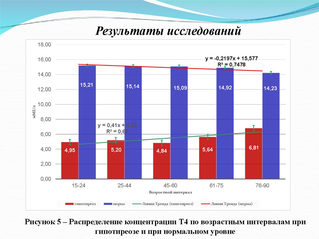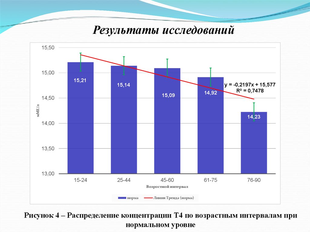 Рисунок 5 – Распределение концентрации Т4 по возрастным интервалам при