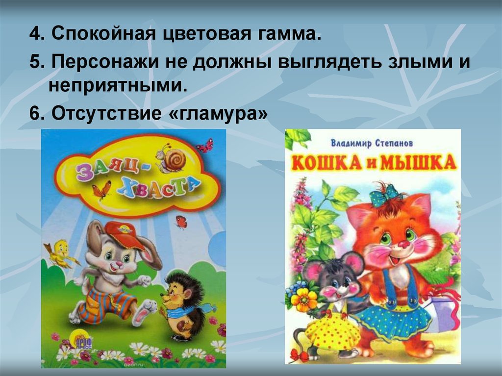 4. Спокойная цветовая гамма.5. Персонажи не должны выглядеть злыми и