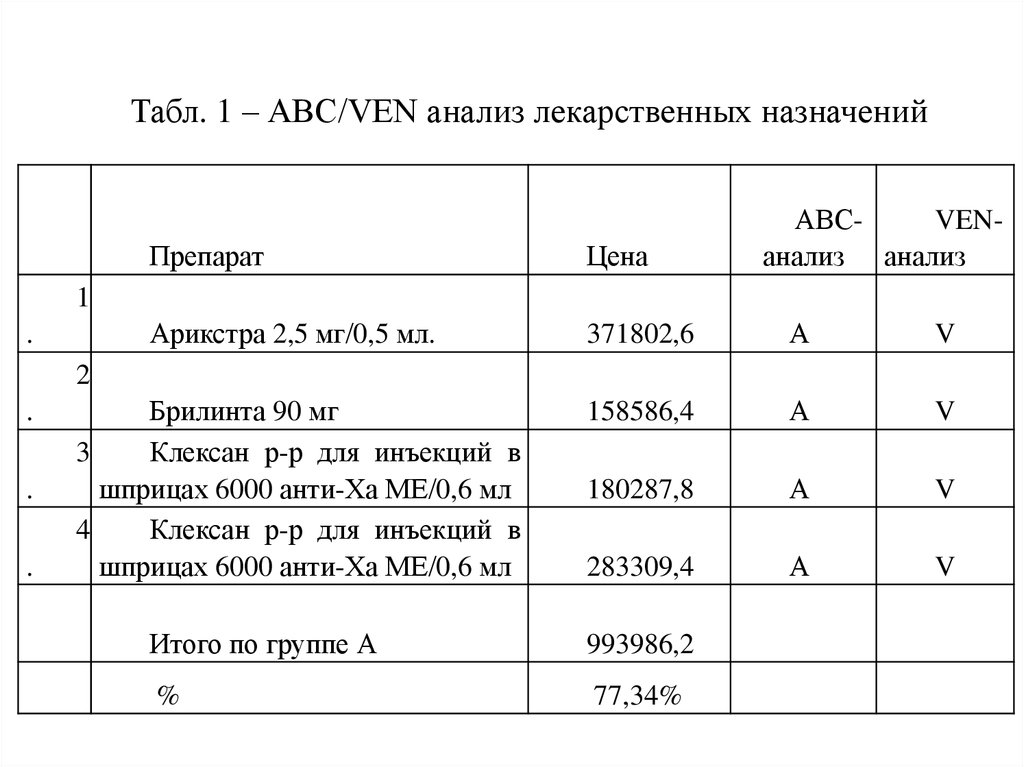 Табл. 1 – АВС/VEN анализ лекарственных назначенийАВСVENанализ анализ