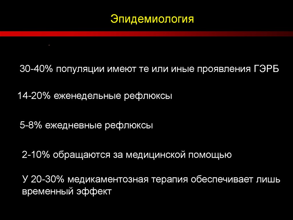 Эпидемиология30-40% популяции имеют те или иные проявления ГЭРБ