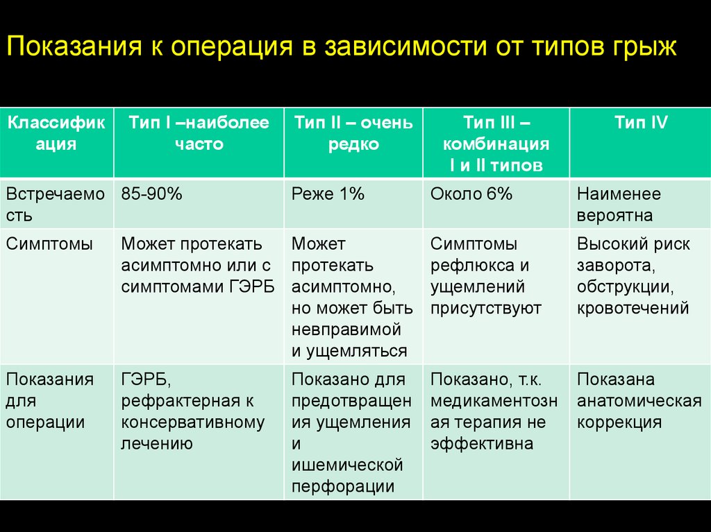 Показания к операция в зависимости от типов грыжКлассифик