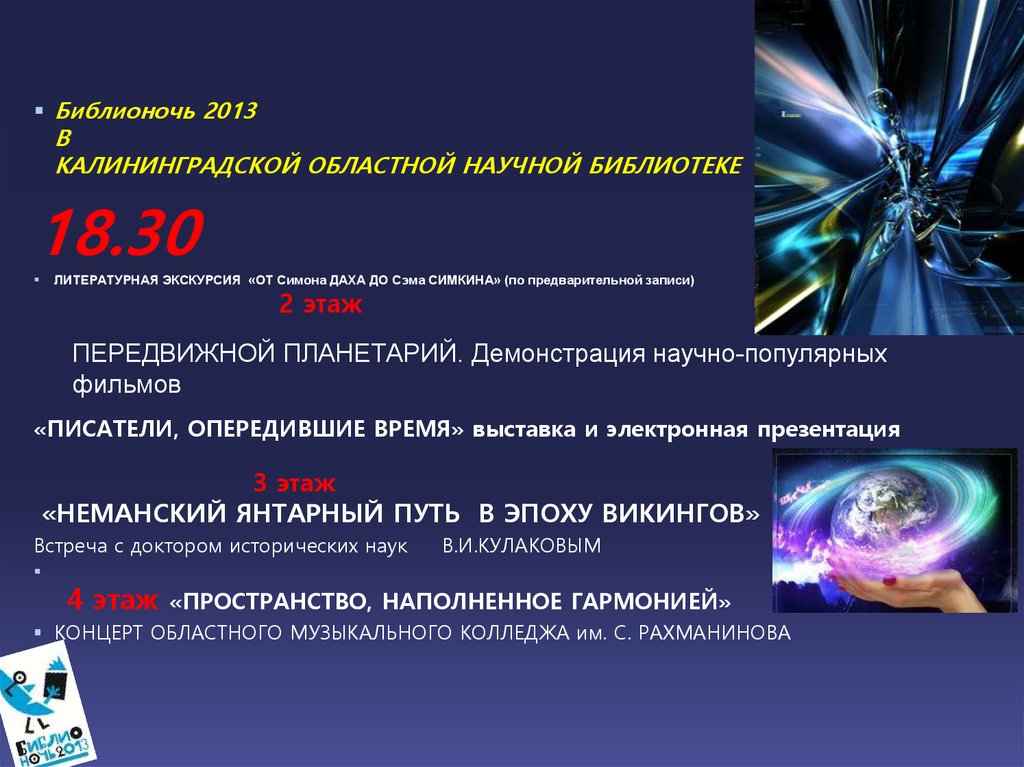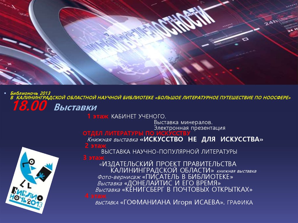 6. Библионочь 2013 В КАЛИНИНГРАДСКОЙ ОБЛАСТНОЙ НАУЧНОЙ БИБЛИОТЕКЕ «БОЛЬШОЕ ЛИТЕРАТУРНОЕ ПУТЕШЕСТВИЕ ПО НООСФЕРЕ»