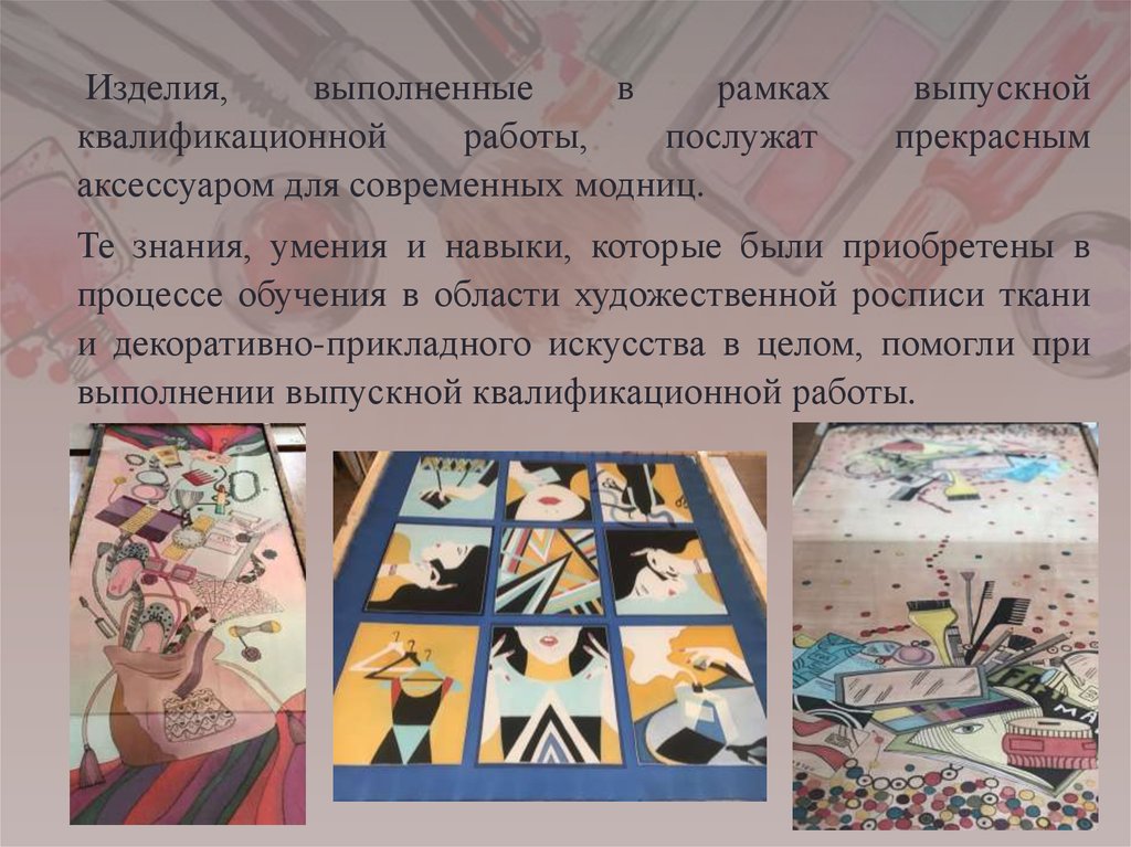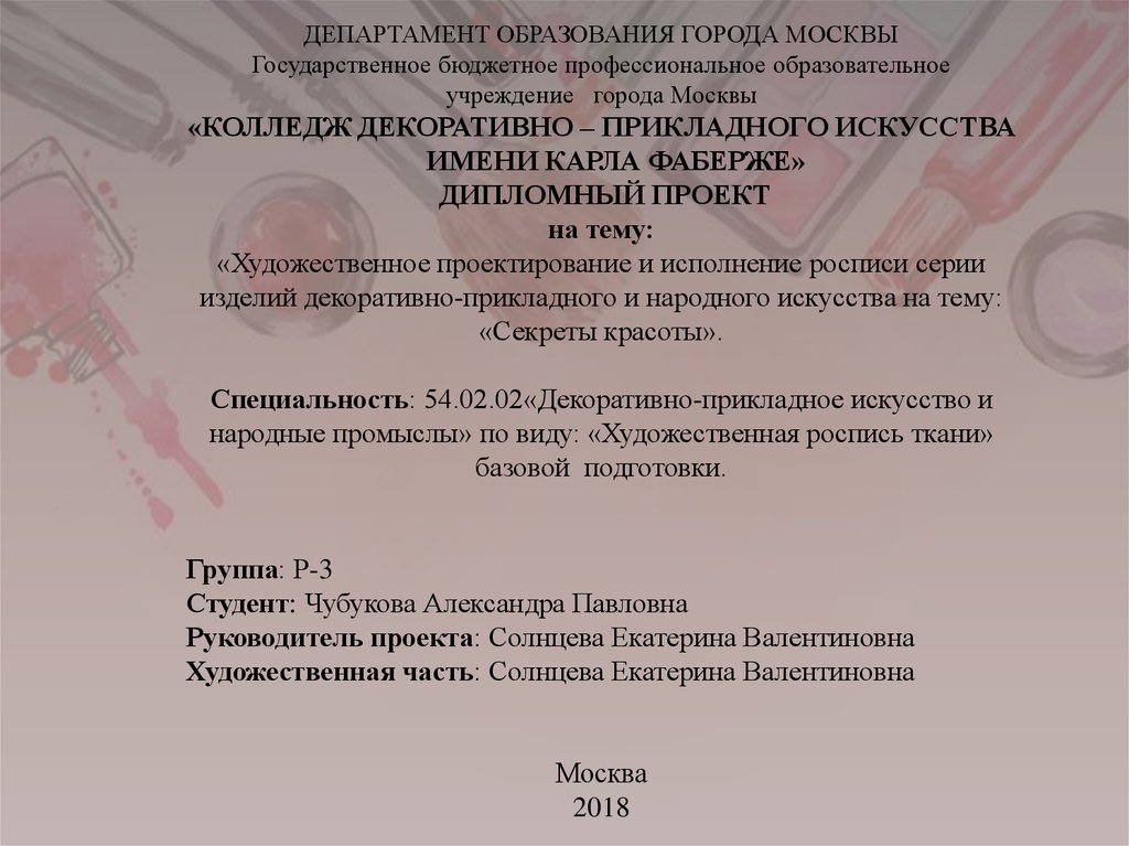 Темой выпускной квалификационной работы является художественноепроектирование серии изделий декоративно-прикладного и народного искусства