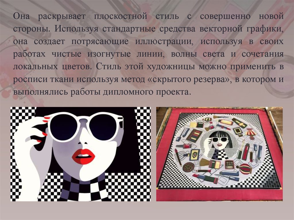 Она раскрывает плоскостной стиль с совершенно новойстороны. Используя стандартные средства векторной графики,