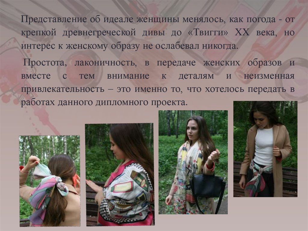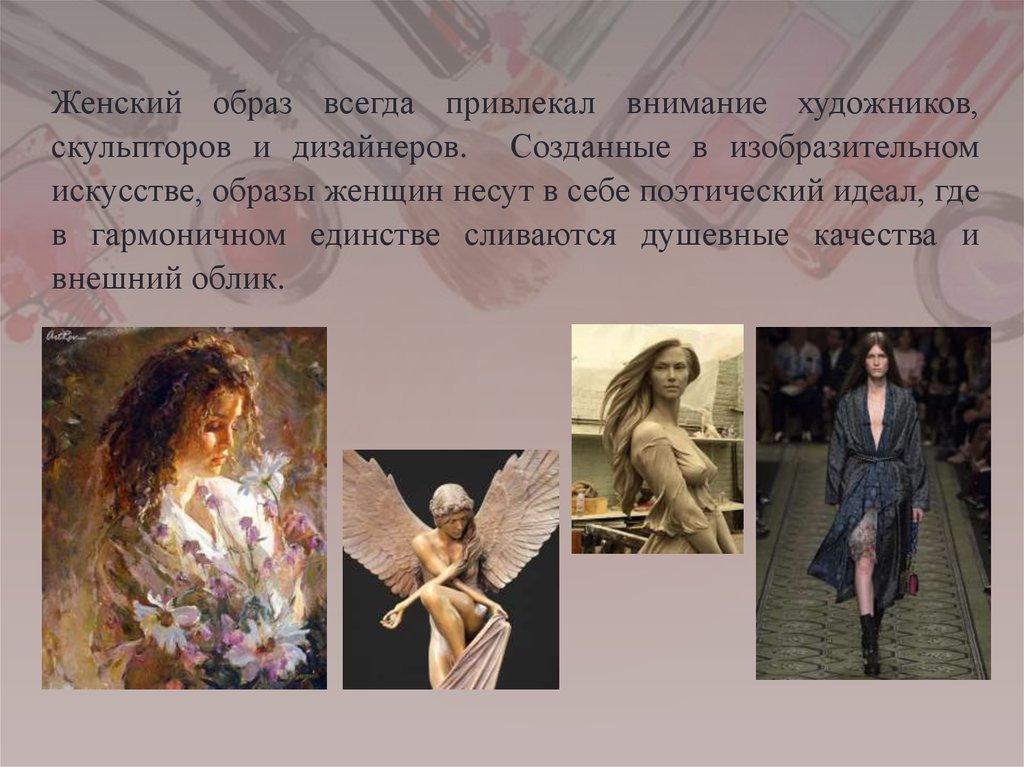 Женский образ всегда привлекал внимание художников,скульпторов и дизайнеров. Созданные в изобразительном
