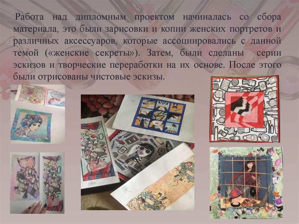 Работа над дипломным проектом начиналась со сбораматериала, это были зарисовки и копии женских портретов и