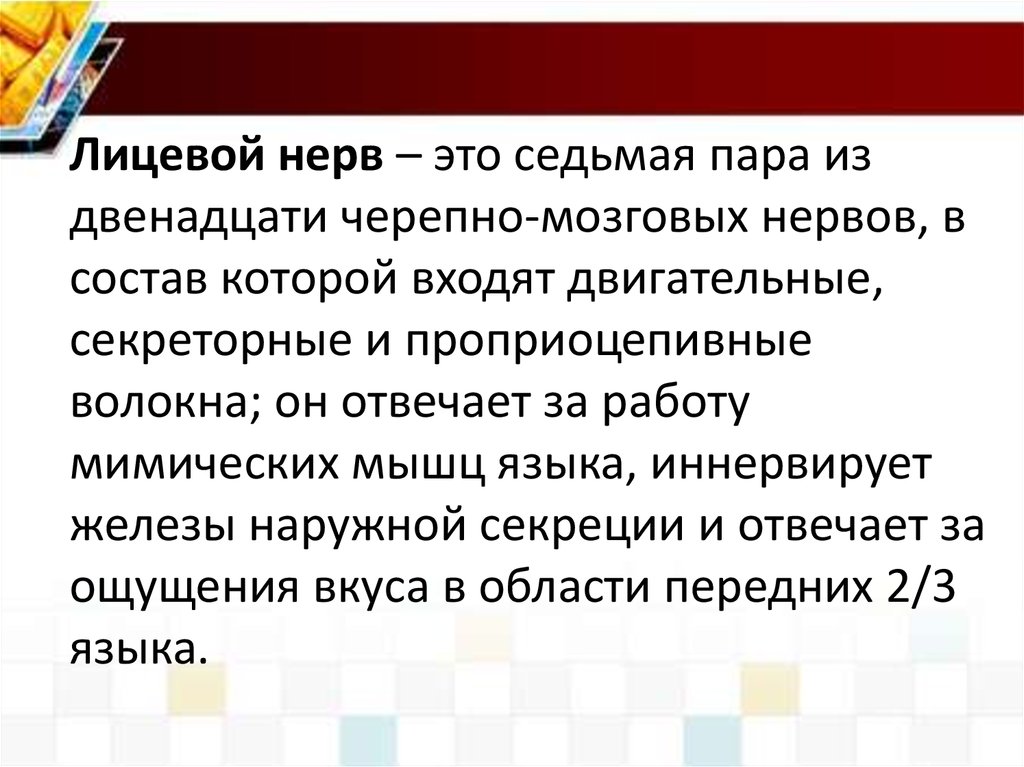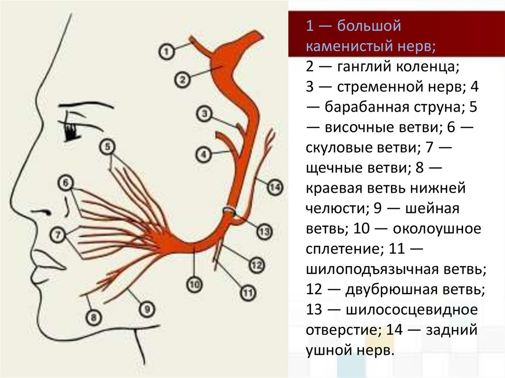 Лицевой нерв – это седьмая пара издвенадцати черепно-мозговых нервов, в