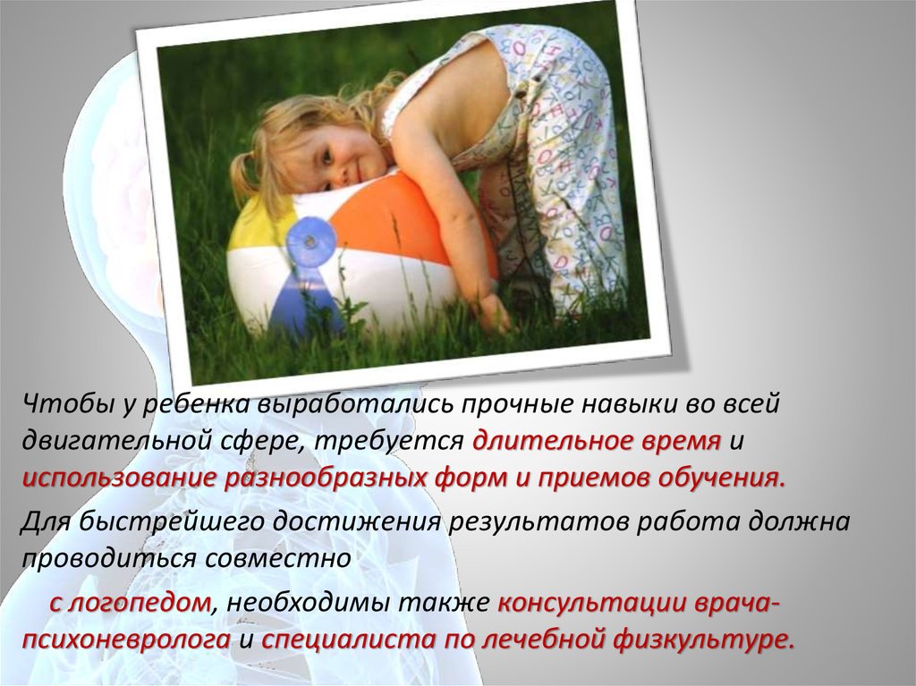 Чтобы у ребенка выработались прочные навыки во всейдвигательной сфере, требуется длительное время и