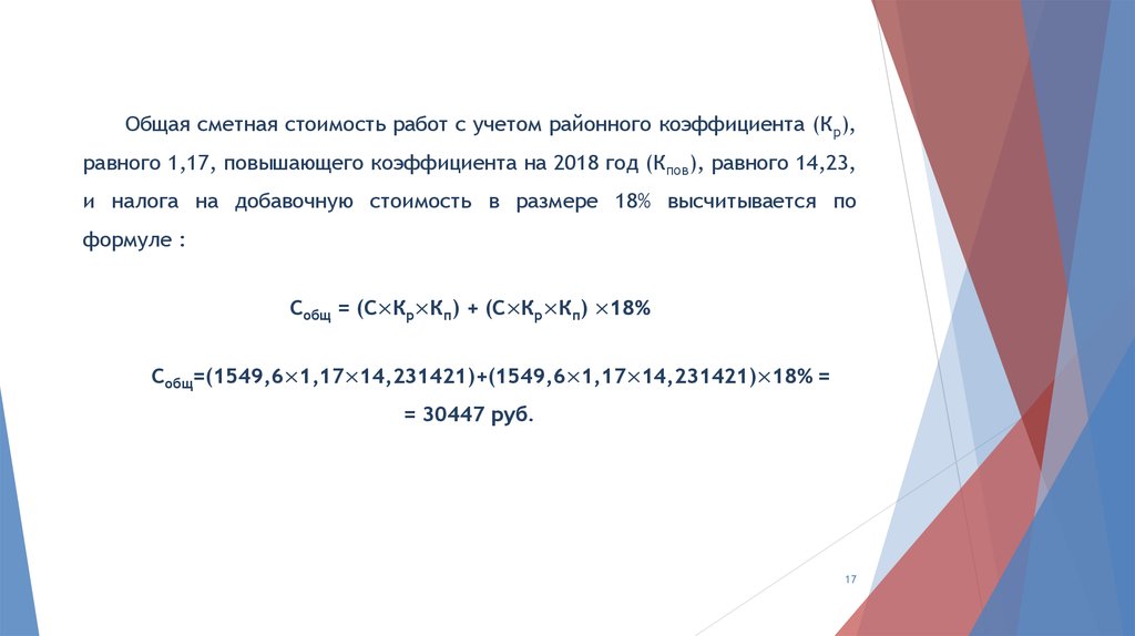 Общая сметная стоимость работ с учетом районного коэффициента (Кр),равного 1,17, повышающего коэффициента на 2018 год (Кпов), равного 14,23,