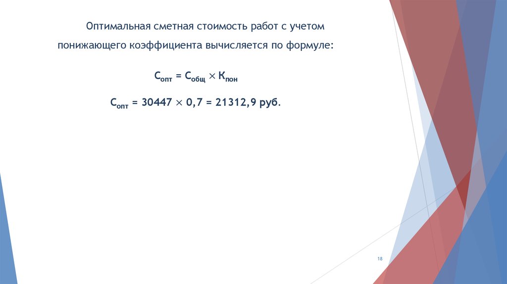 Оптимальная сметная стоимость работ с учетомпонижающего коэффициента вычисляется по формуле: