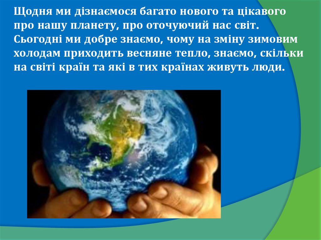 3. Щодня ми дізнаємося багато нового та цікавого про нашу планету, про оточуючий нас світ. Сьогодні ми добре знаємо, чому на зміну