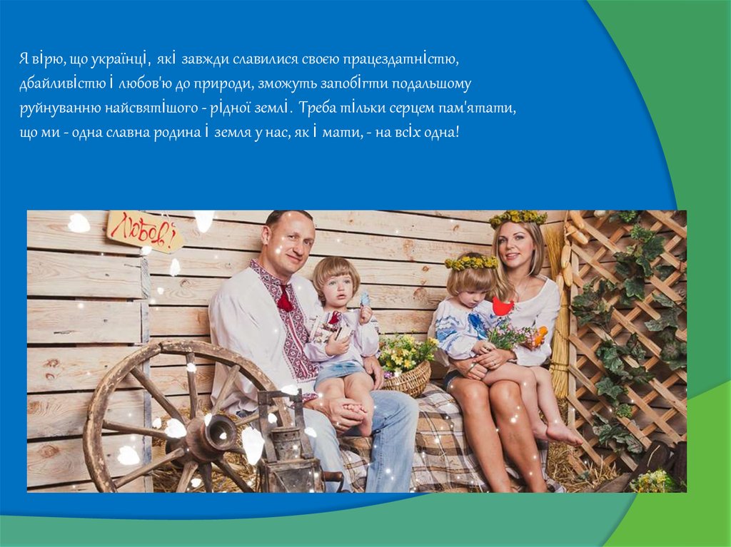 руйнуванню найсвятiшого - рiдної землi. Треба тiльки серцем пам'ятати,що ми - одна славна родина i земля у нас, як i мати, - на всiх одна!
