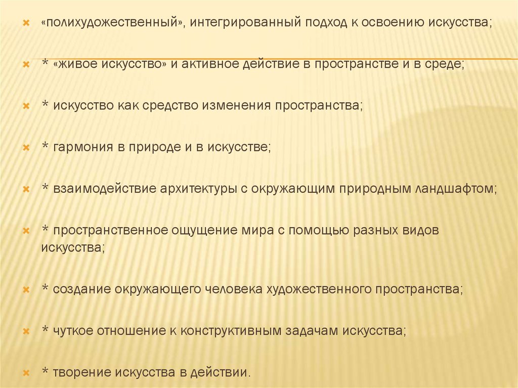 «полихудожественный», интегрированный подход к освоению искусства;* «живое искусство» и активное действие в пространстве и в среде;