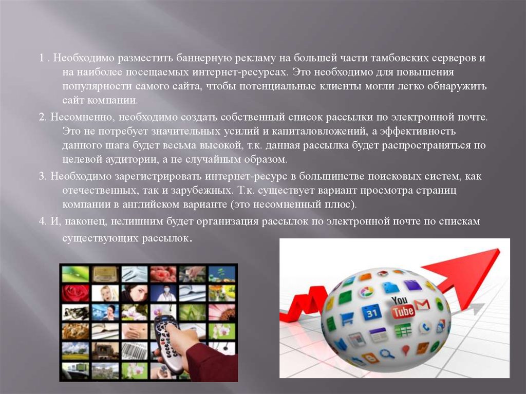 1 . Необходимо разместить баннерную рекламу на большей части тамбовских серверов ина наиболее посещаемых интернет-ресурсах. Это необходимо для повышения