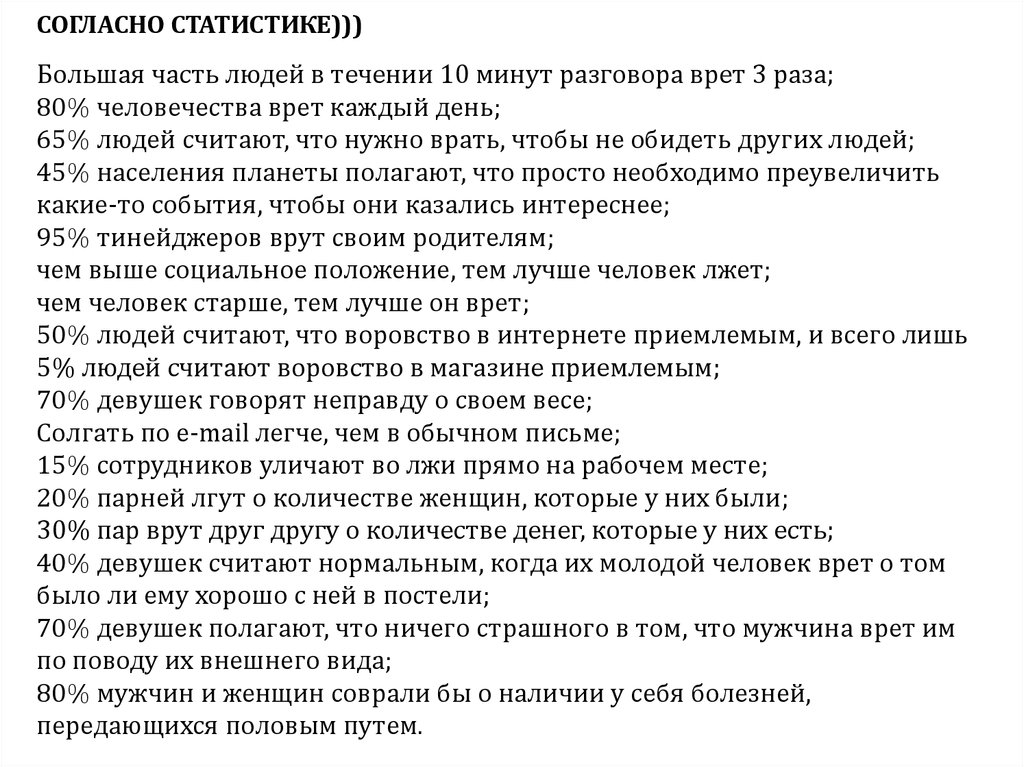 СОГЛАСНО СТАТИСТИКЕ)))Большая часть людей в течении 10 минут разговора врет 3 раза;