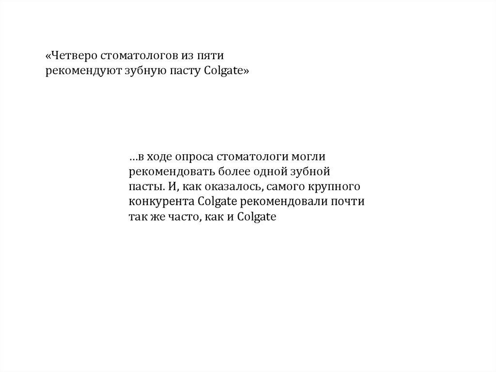 «Четверо стоматологов из пятирекомендуют зубную пасту Colgate»