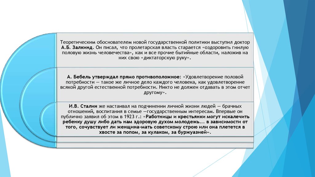 Теоретическим обоснователем новой государственной политики выступил докторА.Б. Залкинд. Он писал, что пролетарская власть старается «оздоровить гнилую