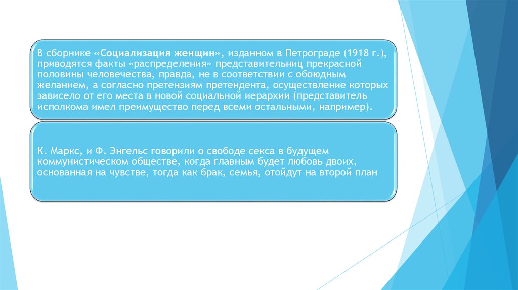 В сборнике «Социализация женщин», изданном в Петрограде (1918 г.),приводятся факты «распределения» представительниц прекрасной