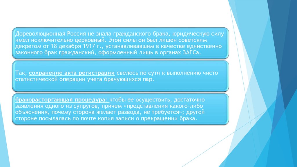 Дореволюционная Россия не знала гражданского брака, юридическую силуимел исключительно церковный. Этой силы он был лишен советским