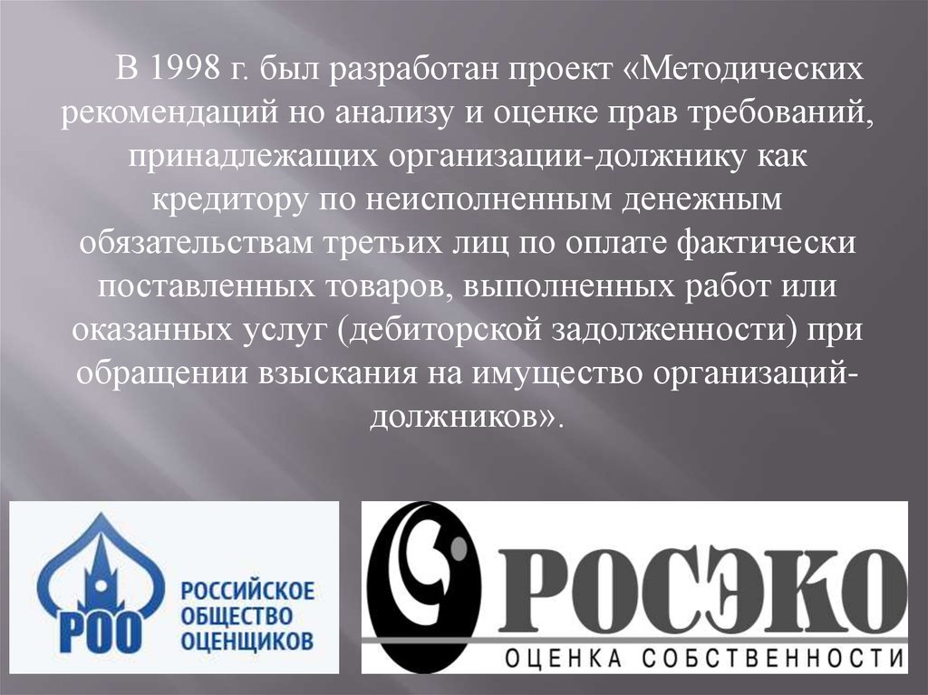 В 1998 г. был разработан проект «Методическихрекомендаций но анализу и оценке прав требований,