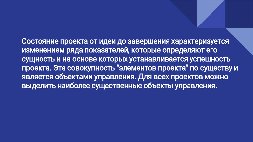 Состояние проекта от идеи до завершения характеризуетсяизменением ряда показателей, которые определяют его