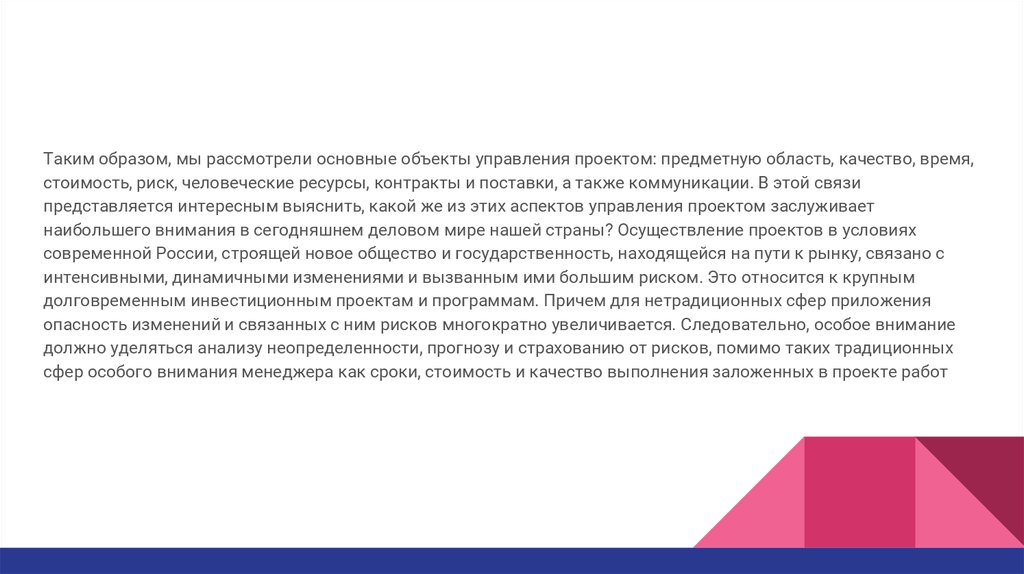 Таким образом, мы рассмотрели основные объекты управления проектом: предметную область, качество, время,стоимость, риск, человеческие ресурсы, контракты и поставки, а также коммуникации. В этой связи