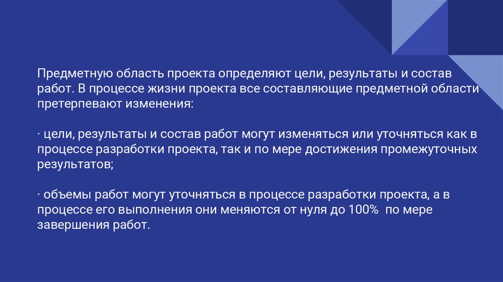 Предметную область проекта определяют цели, результаты и составработ. В процессе жизни проекта все составляющие предметной области