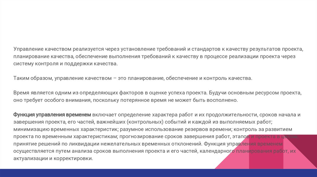 Управление качеством реализуется через установление требований и стандартов к качеству результатов проекта,планирование качества, обеспечение выполнения требований к качеству в процессе реализации проекта через