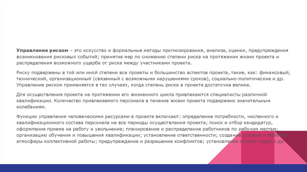 Риск в контексте проекта рассматривается как воздействие на проект и его элементы непредвиденных событий,
