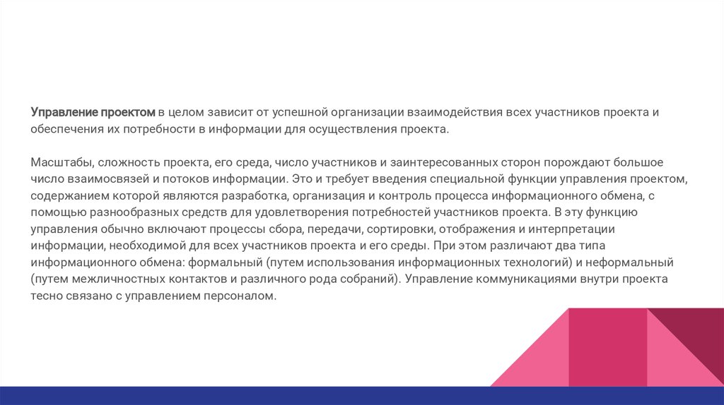 Управление проектом в целом зависит от успешной организации взаимодействия всех участников проекта иобеспечения их потребности в информации для осуществления проекта.