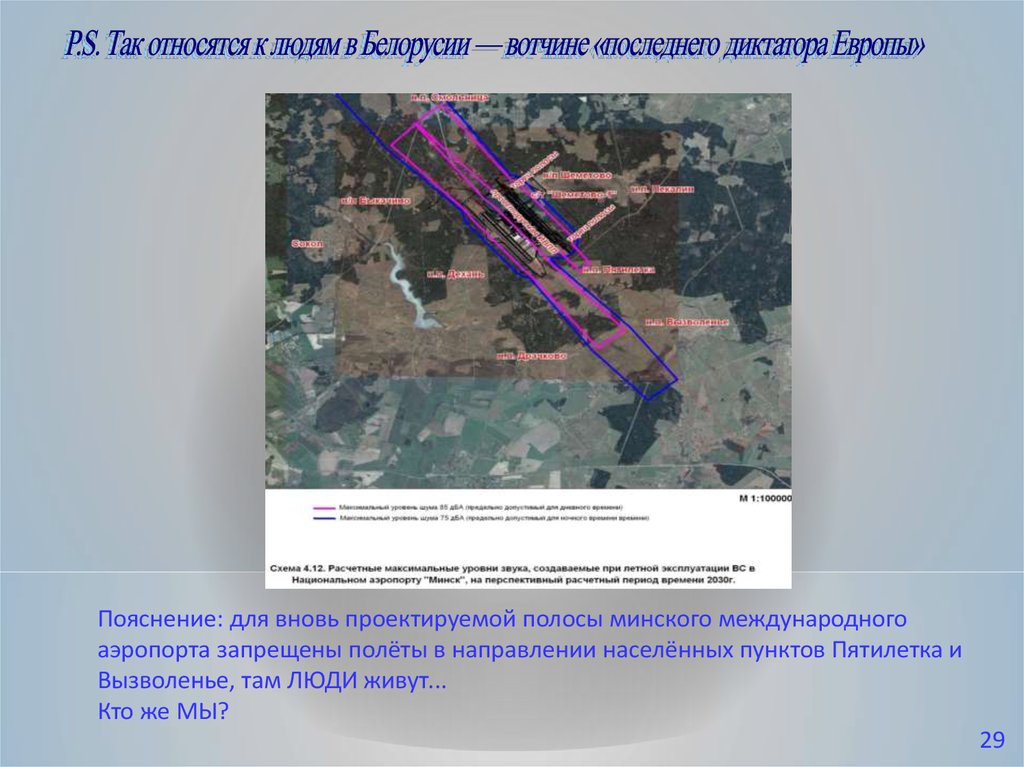 Пояснение: для вновь проектируемой полосы минского международногоаэропорта запрещены полёты в направлении населённых пунктов Пятилетка и