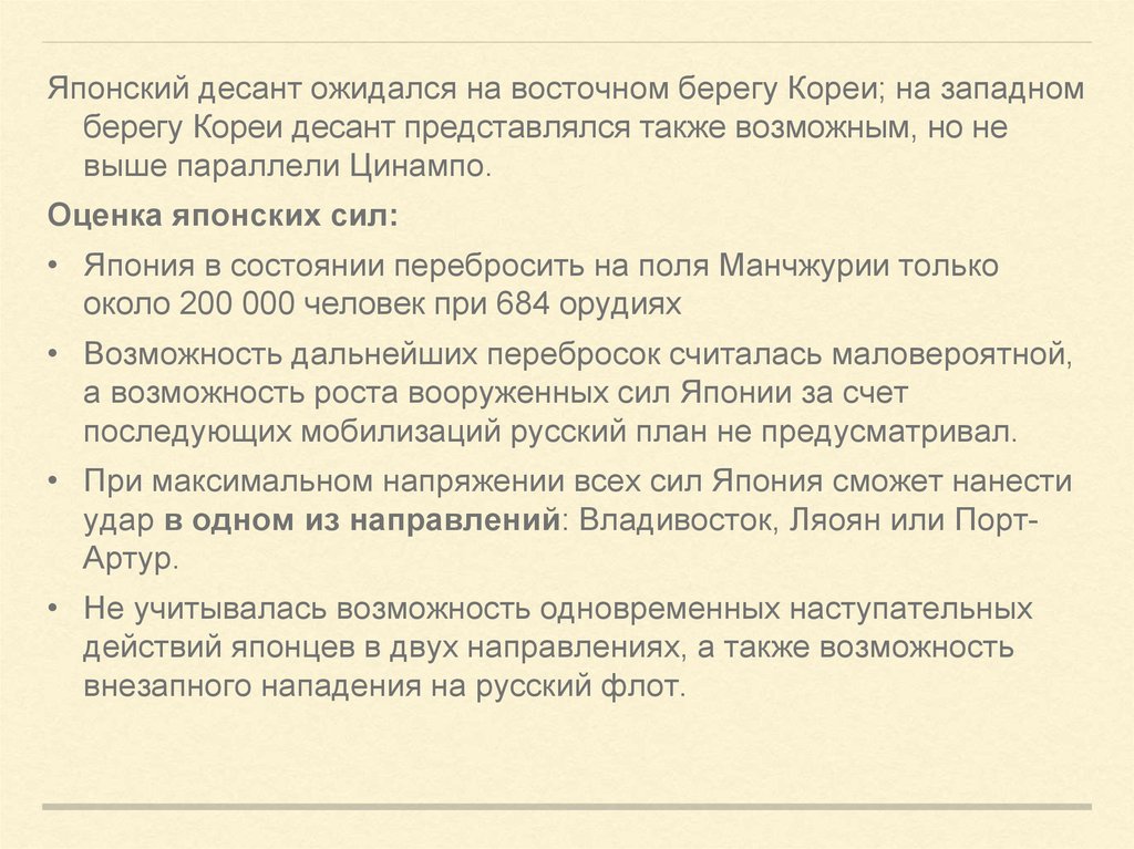 Японский десант ожидался на восточном берегу Кореи; на западномберегу Кореи десант представлялся также возможным, но не