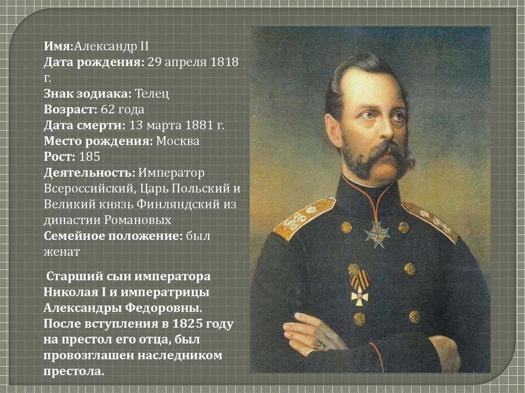 Имя:Александр IIДата рождения: 29 апреля 1818
