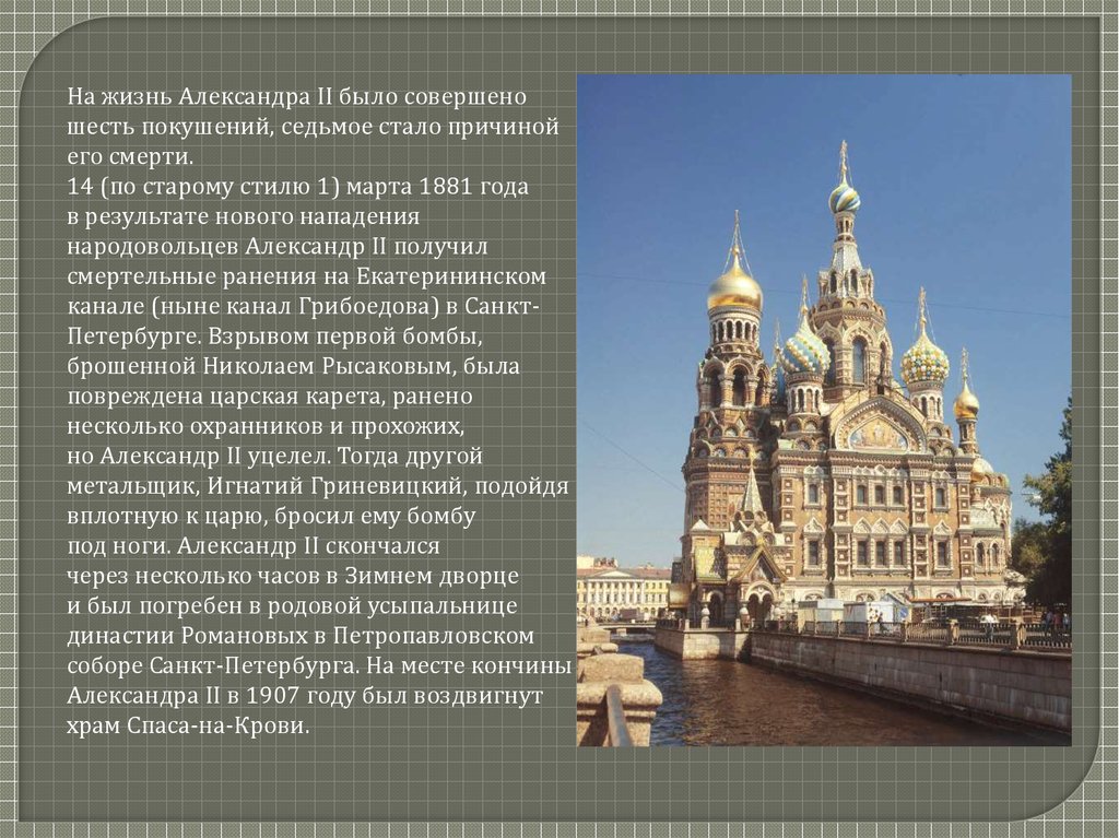 канале (ныне канал Грибоедова) в СанктПетербурге. Взрывом первой бомбы,