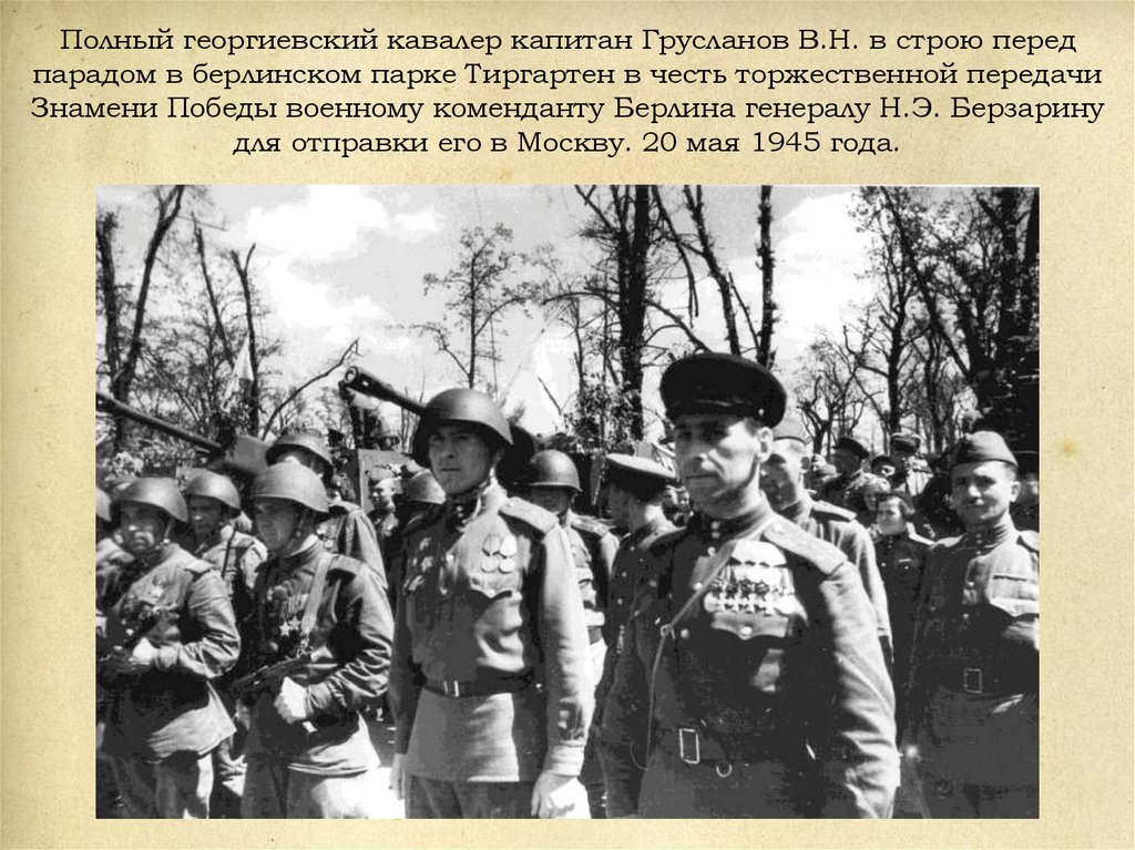 Полный георгиевский кавалер капитан Грусланов В.Н. в строю передпарадом в берлинском парке Тиргартен в честь торжественной передачи