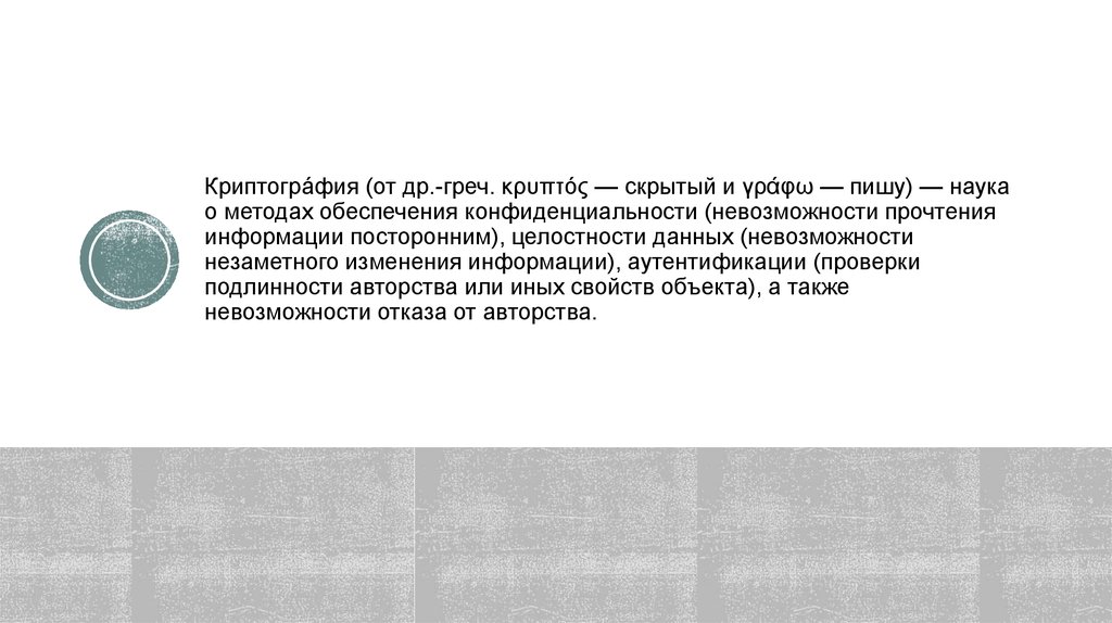 Криптогра́фия (от др.-греч. κρυπτός — скрытый и γράφω — пишу) — наукао методах обеспечения конфиденциальности (невозможности прочтения